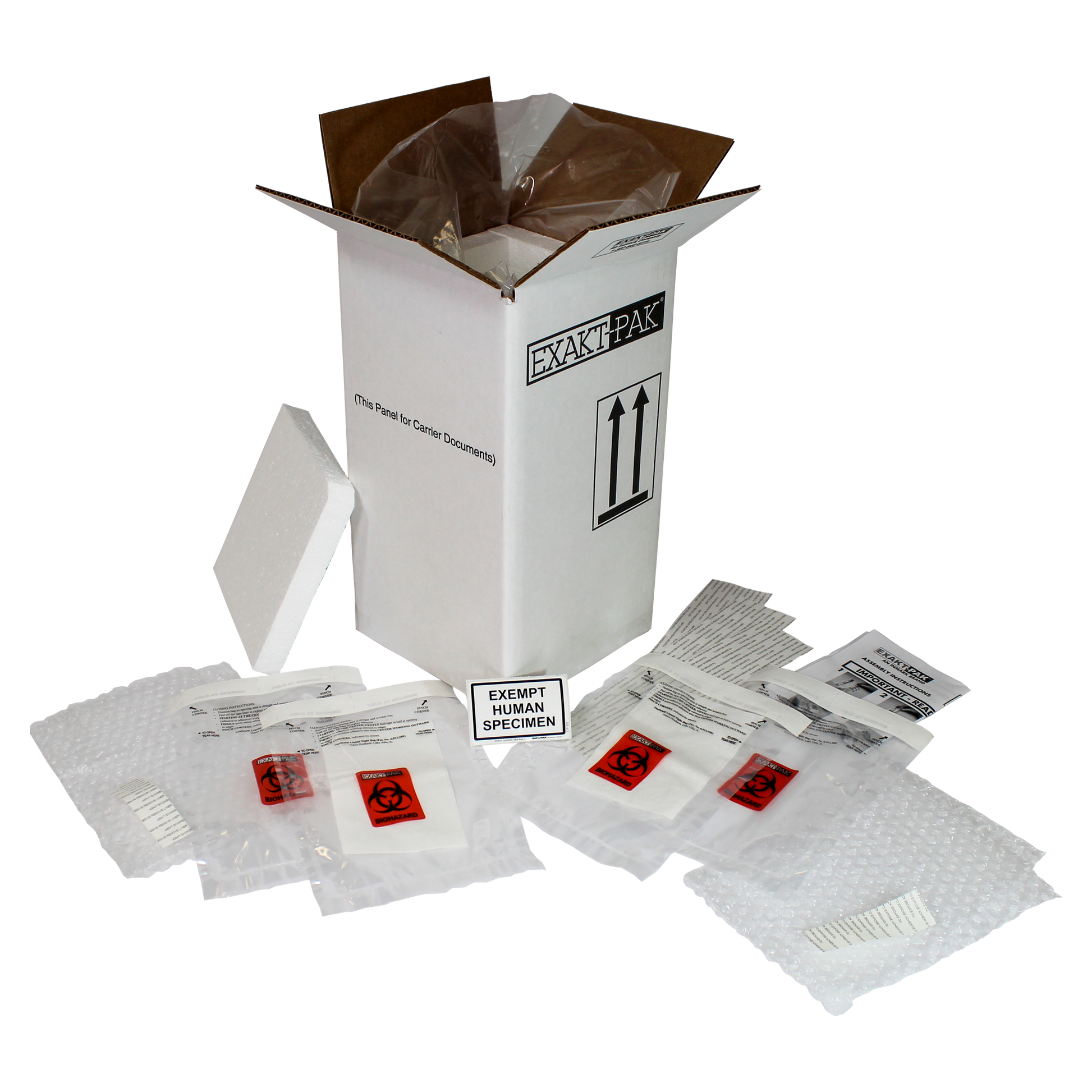 The outer corrugated box is preprinted with either an Exempt Human Specimen or Exempt Animal Specimen label so the package is complete, just waiting for your samples and a list of contents to go inside the corrugated box.